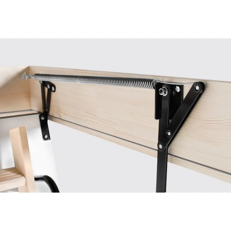 Складная 3-х секционная чердачная лестница. Рабочая поверхность полностью выполнена из алюминия. Термоизоляционная крышка типа "сэндвич" имеет усиленную теплозащиту, облицована с двух сторон ДВП белого цвета. По контуру короба имеется уплотнитель; Все металлические элементы лестницы покрыты порошковой краской.