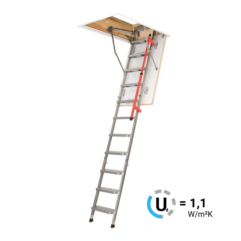 Складная металлическая чердачная лестница FAKRO LML Lux выполнена из оцинкованной стали, оснащена телескопическими ножками с наконечниками, которые позволяют подогнать лестницу под высоту потолка.