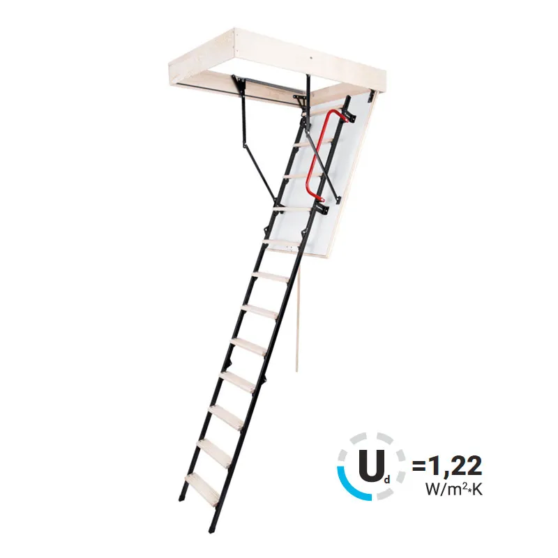 Модель STALLUX идеально подходит для условий, когда чердак утеплен и не требует дополнительной теплоизоляции. Направляющие изготовлены из стали, а ступени - из сосны. Термоизоляционная крышка типа "сэндвич", толщиной 30 мм, утеплена пенопластом, облицована с двух сторон ДВП белого цвета.