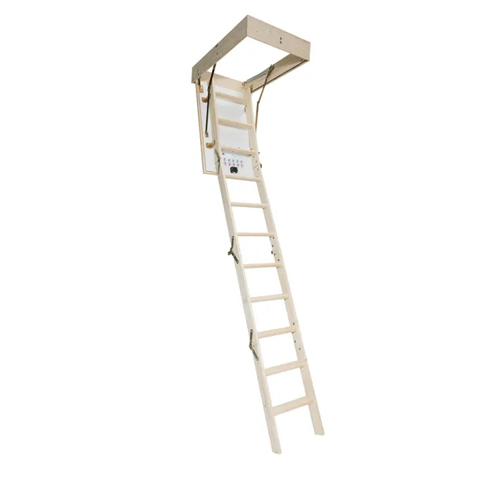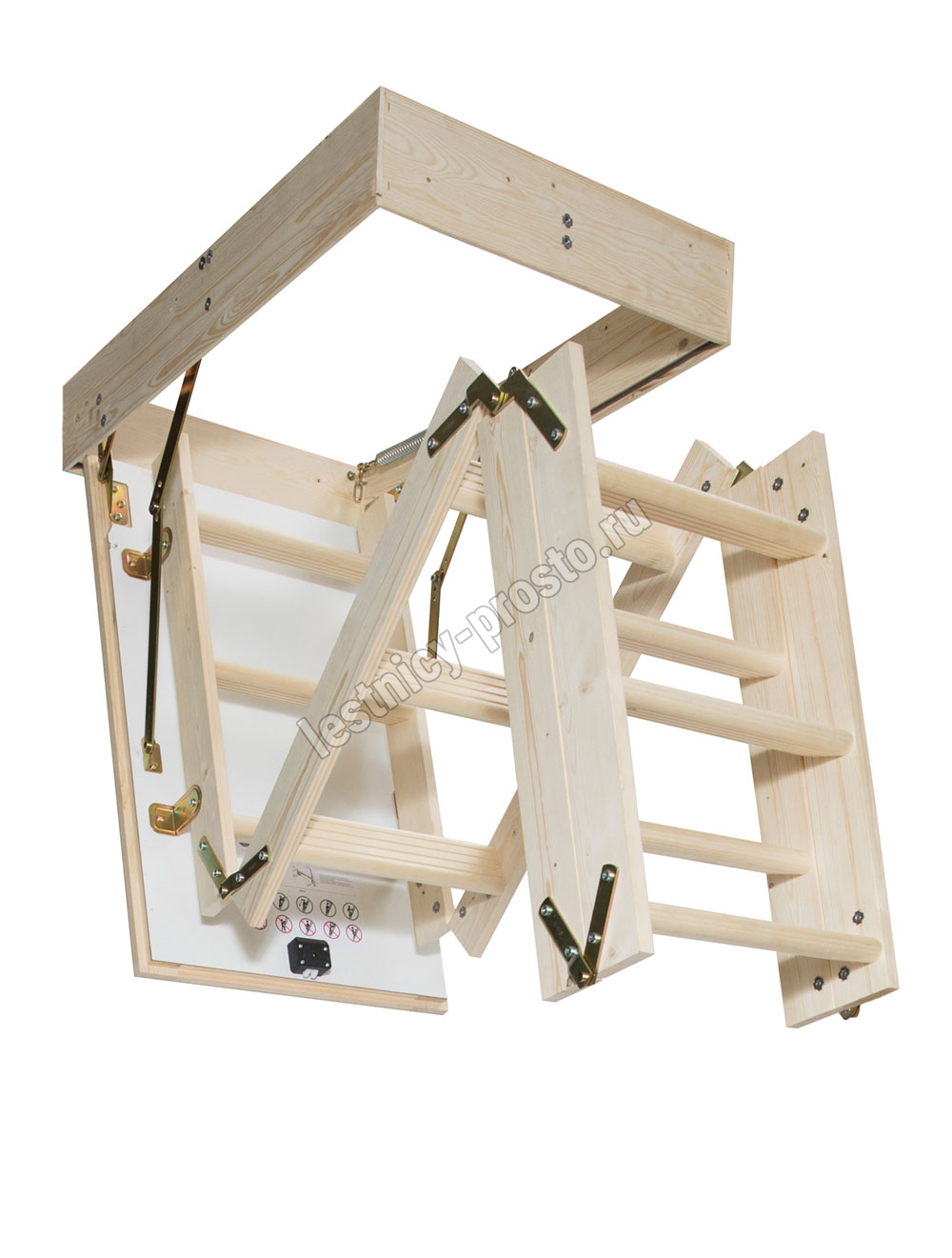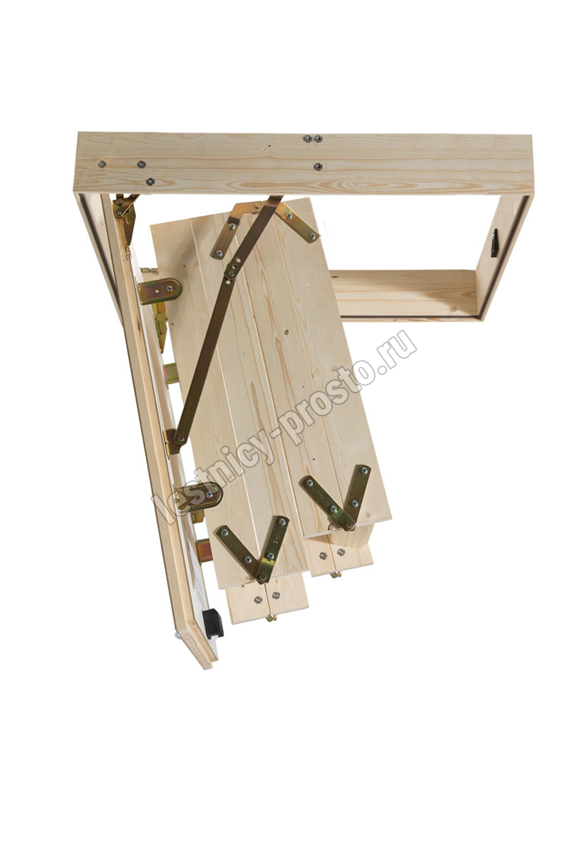 Четырехсекционная складная лестница из ели. Высота лестницы от потолка до пола: 2870 мм, с помощью дополнительной секции можно увеличить высоту до 3300 мм