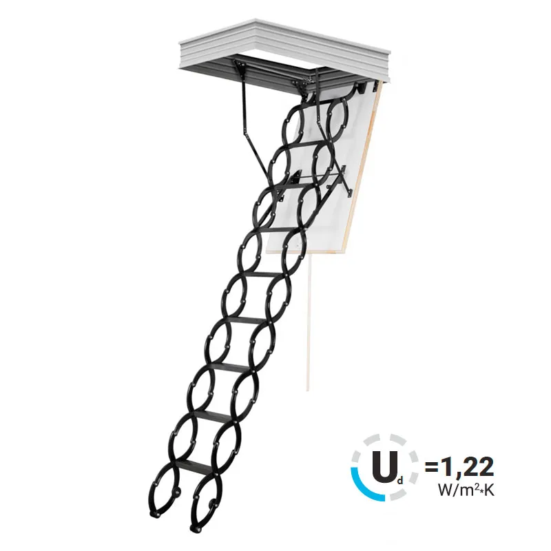 Данную модель лестницы можно использовать даже в домах, где значительна разница температур между этажами, и тем самым ограничить проникновение холода в жилые помещения. Лестница состоит из трех секций, которые компактно складываются и «хранятся в потолке». Крышка люка облицована ДВП белого цвета, что делает ее практически незаметной при установке в светлом или белом потолке.