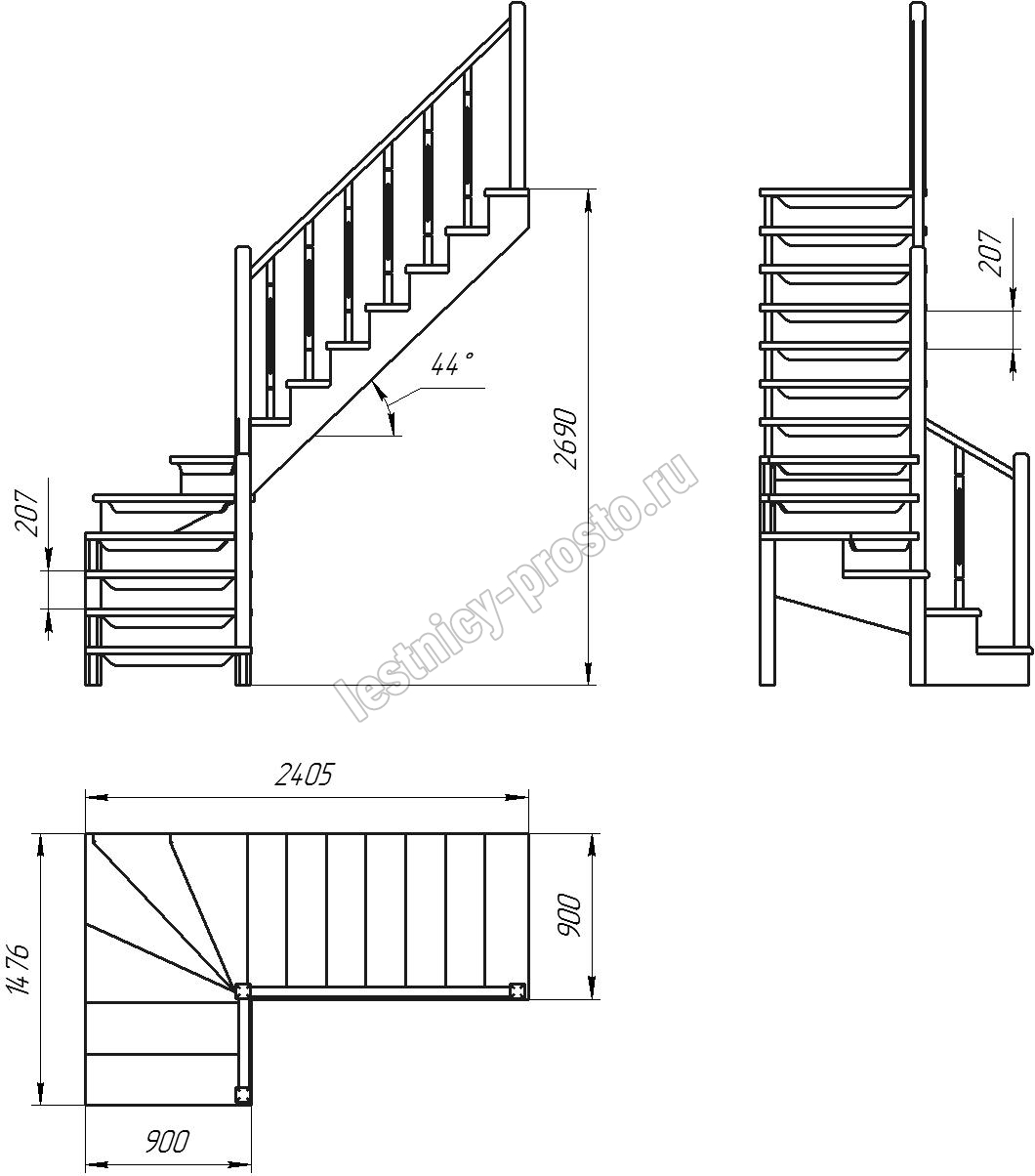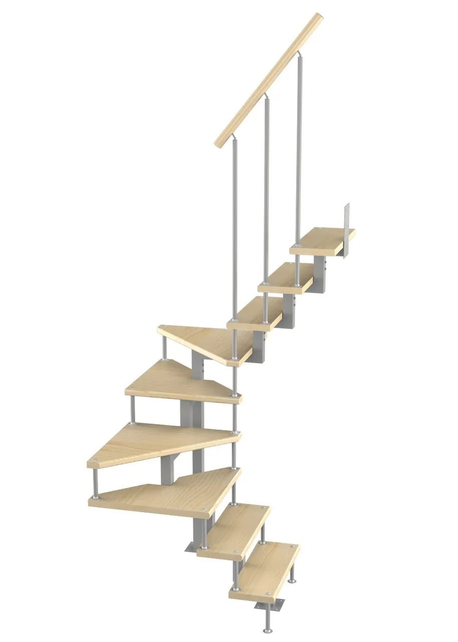 Удобная лестница на косоурах с поворотом на 90 градусов. Открытые ступени визуально облегчают конструкцию. Ограждения по всему маршу обеспечивают дополнительную безопасность и возможность декорирования. Монтаж осуществляется силами двух человек на объекте по указаниям, приведенным в паспорте на лестницу.