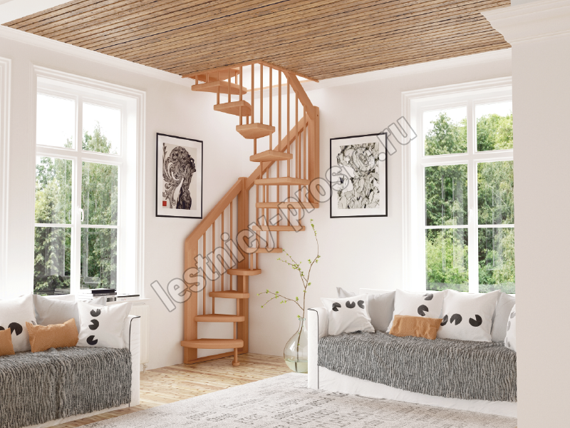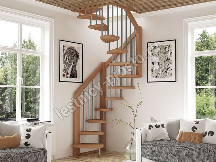Базовый комплект включает в себя деревянные элементы лестницы и ограждения без какого-либо покрытия. Стильная сверхмалогабаритная лесенка, она выручит в таких помещениях, где установка других лестниц проблематична из-за нехватки пространства.