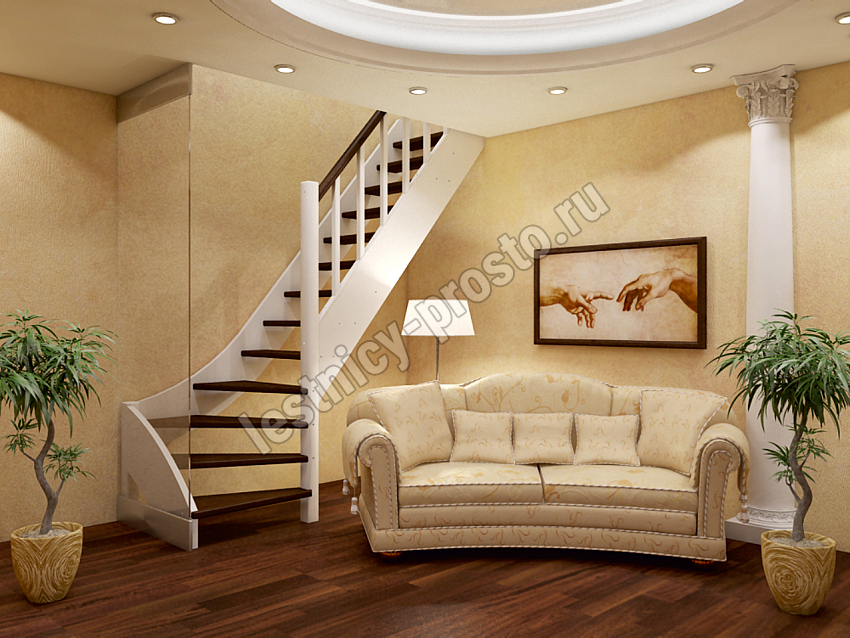Базовый комплект включает в себя деревянные элементы лестницы и ограждения без какого-либо покрытия. Лестница под покраску изготовлена из сосны с небольшими участками синевы, которая мало влияет на механические свойства материала и практически незаметна при покраске лестницы в тёмные цвета, однако позволяет снизить стоимость готовой лестницы, по эксплуатационным свойствам ничем не отличающейся от более дорогого аналога.