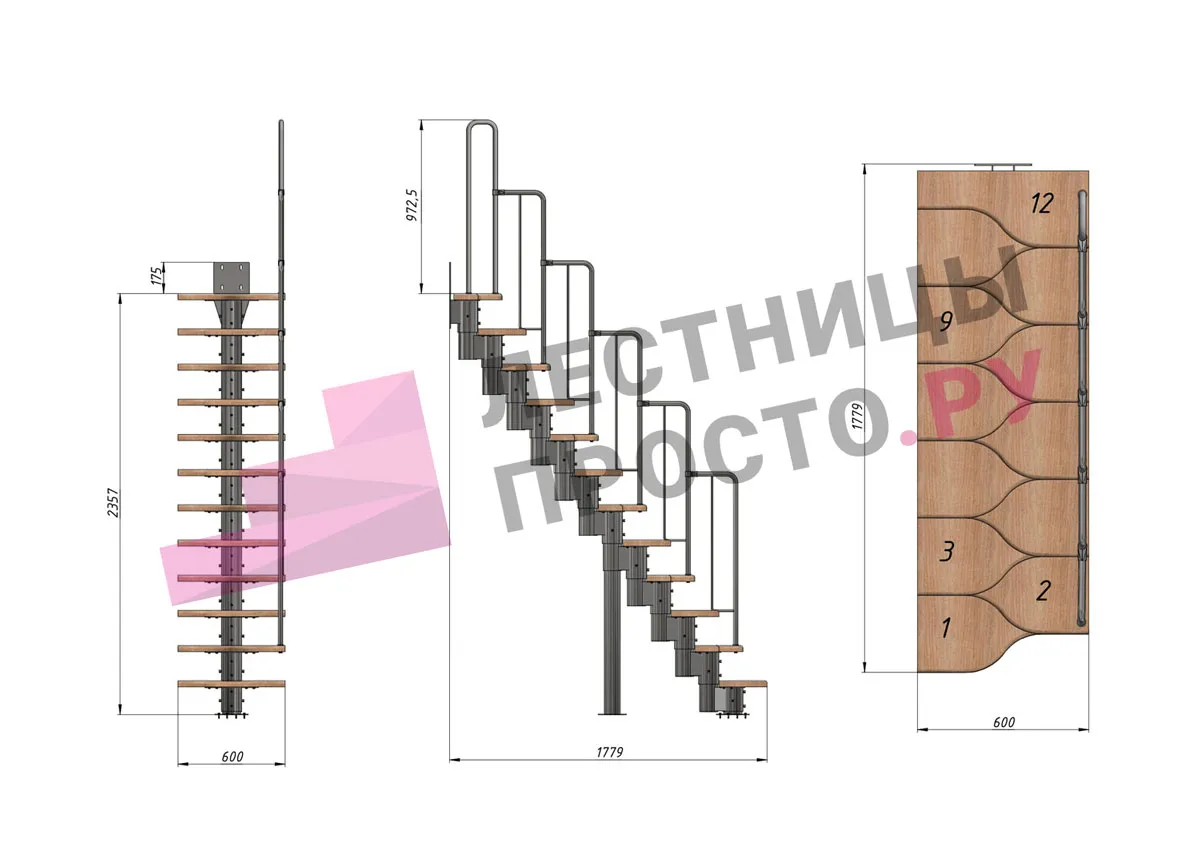 Лестница Prosto Urban Black гусиный шаг 600 мм/ Ступени из берёзы мультиплекс
