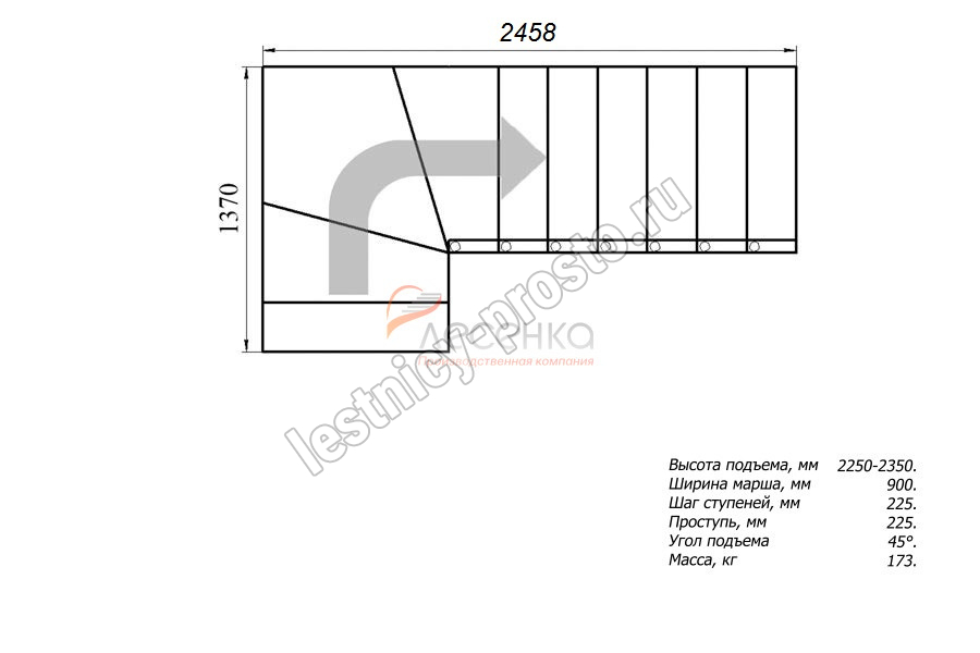 Модульная лестница Фаворит 225 2250-2350, Серый, Сосна, Нержавеющая сталь