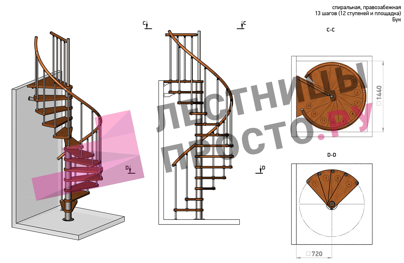 Правая, d=140см, 13 ступеней + площадка