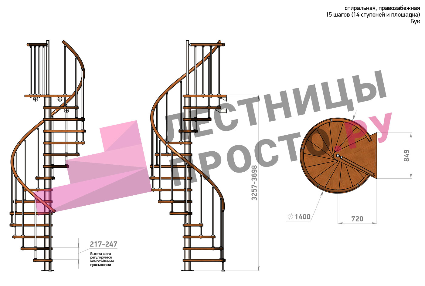 Винтовая лестница Prosto Spiral White D140см, h260.5-304.6 см, бук |