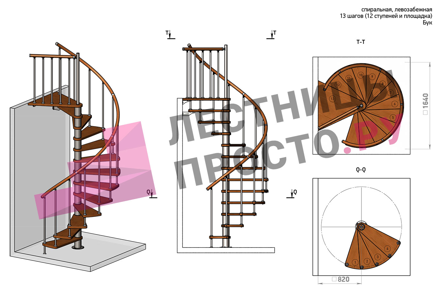 Винтовая лестница Prosto Spiral White D140см, h325.7-369.8 см, бук |